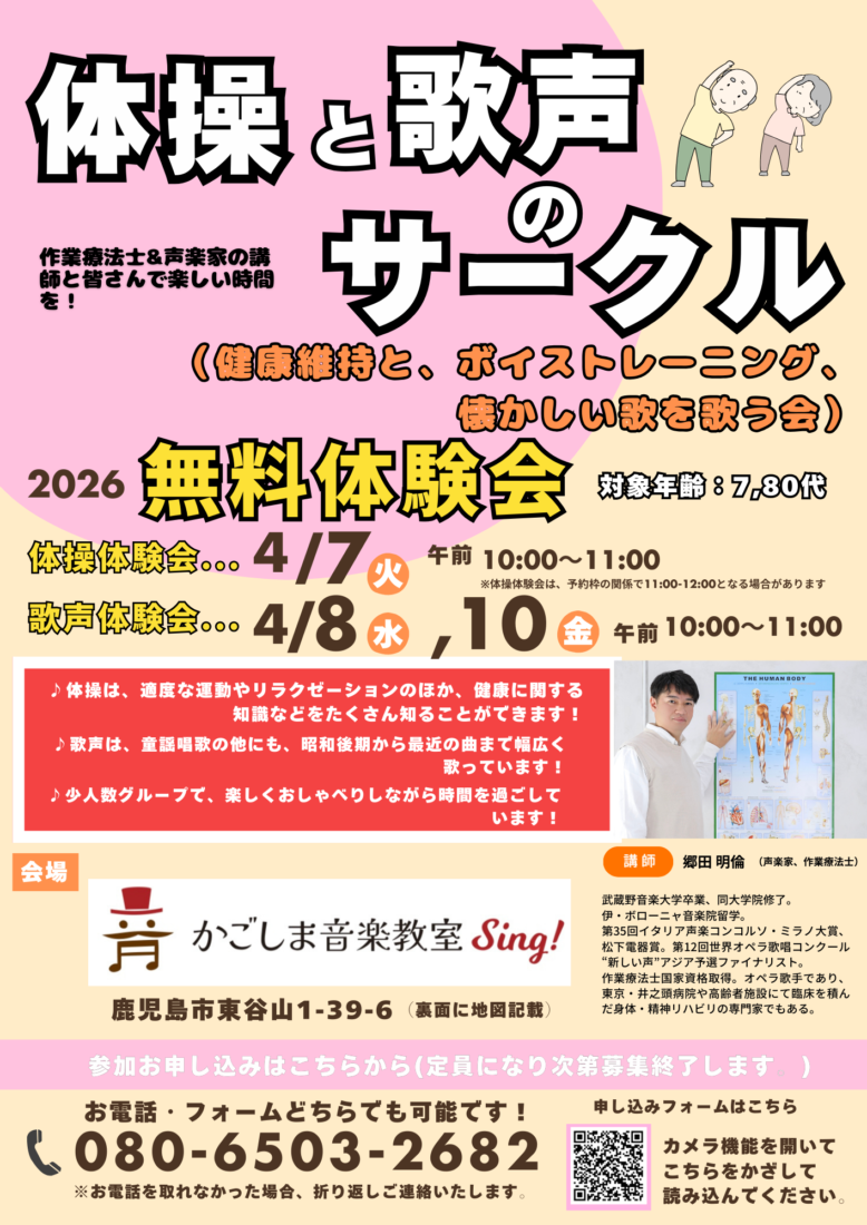 月参加費:体操のみ→4500円 体操+歌サークル→7800円(毎月の初回参加時に納めていただきます)